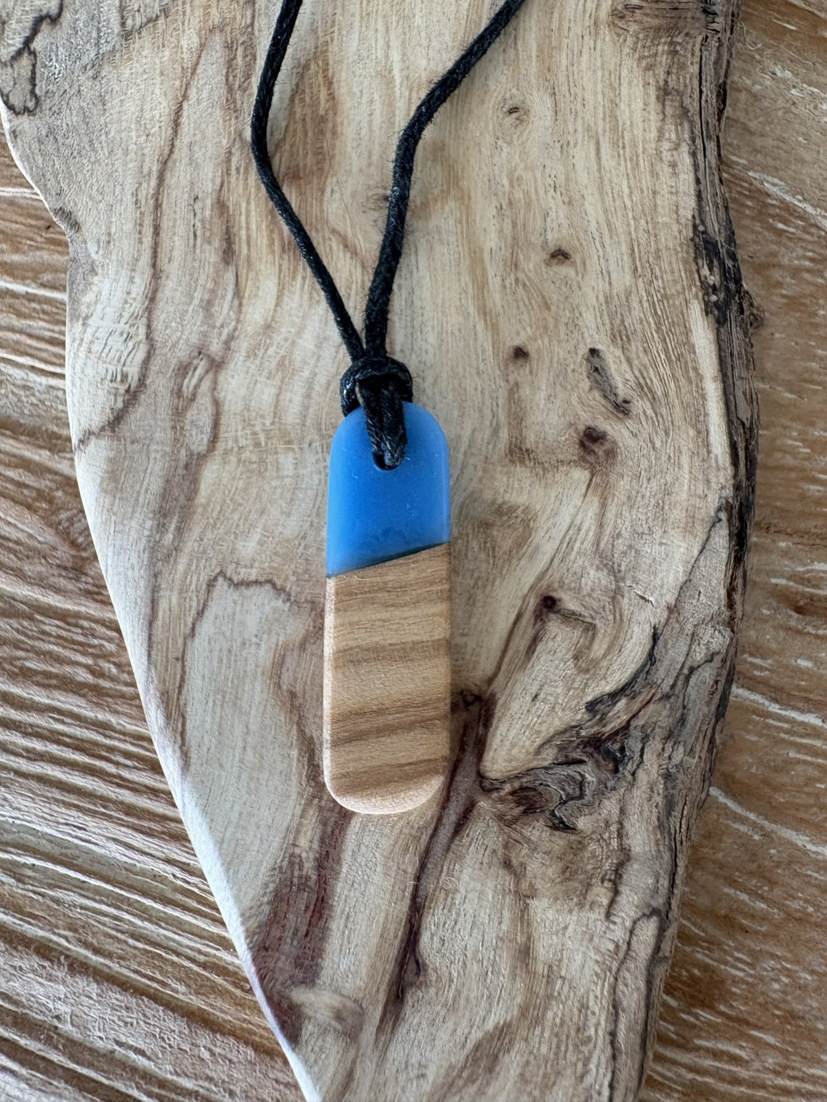 Anhänger für Halskette aus hellem Eichenholz und blauem Epoxidharz, horizontal.